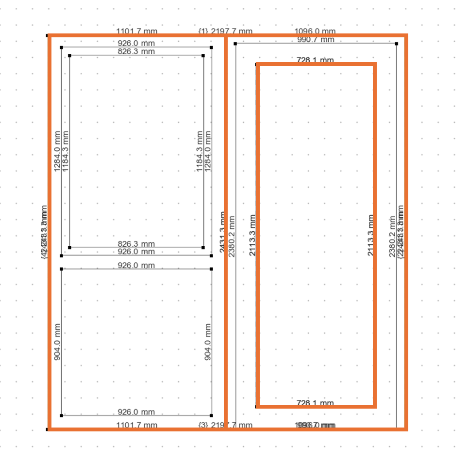 In deze situatie is het glas < 65% ten opzichte van de deur en moet het glas in de deur worden gesplitst.