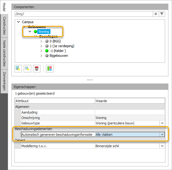 Om wel of geen rekening te houden met Beschaduwingselementen wordt bepaald in de BUILDER.