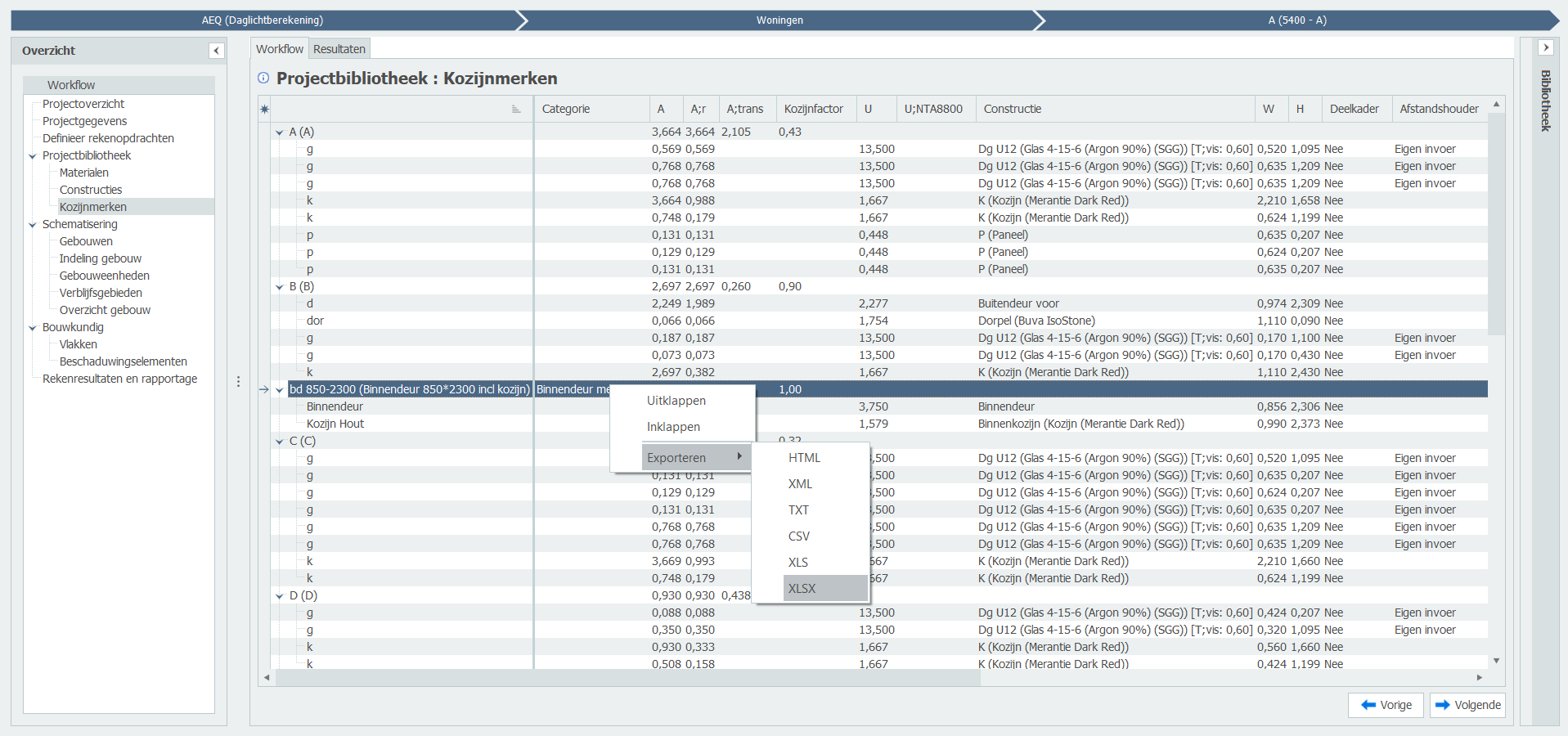 In de workflow kunnen veel tabellen geexporteerd worden. Als je bijvoorbeeld de gegevens van kozijnmerken wilt exporteren, klik dan in de tabel op de rechtermuisknop zoals je ziet in de afbeelding hieronder (afb. 1). Vervolgens krijg je een aantal opties voor export mogelijkheden.