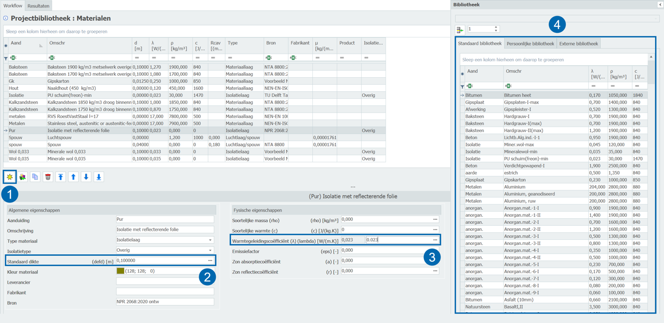 - Pas de standaard dikte [m] Material(defd) van de materiaallaag aan.