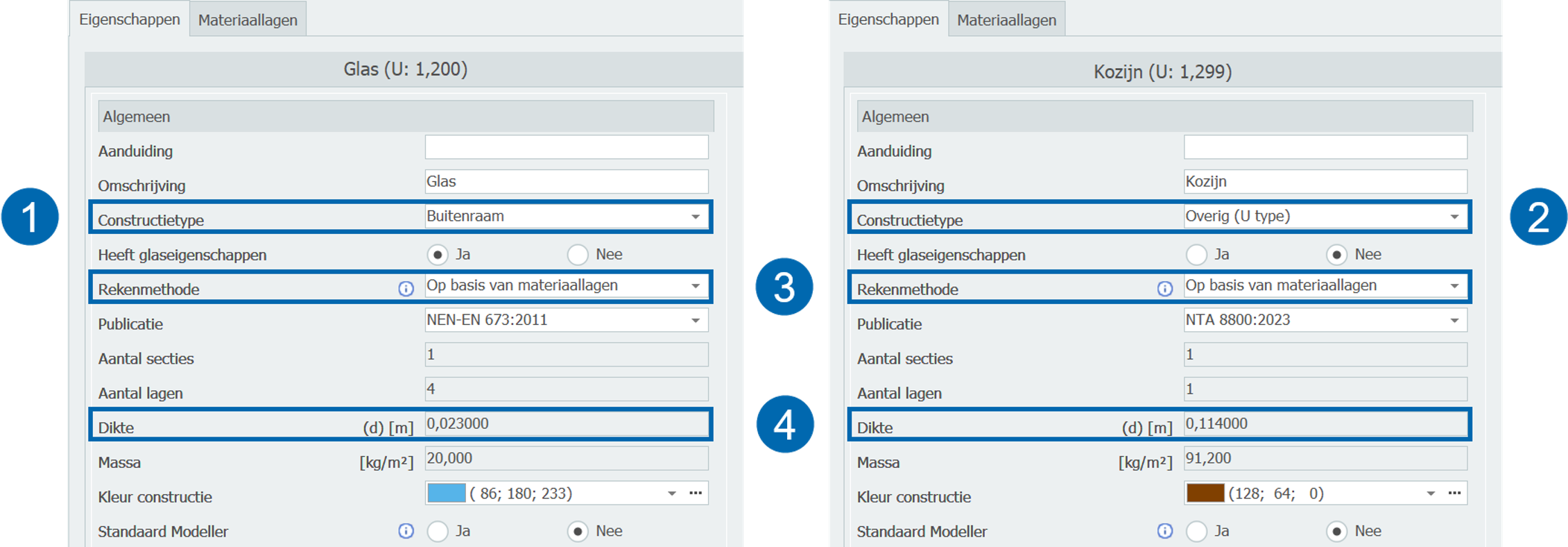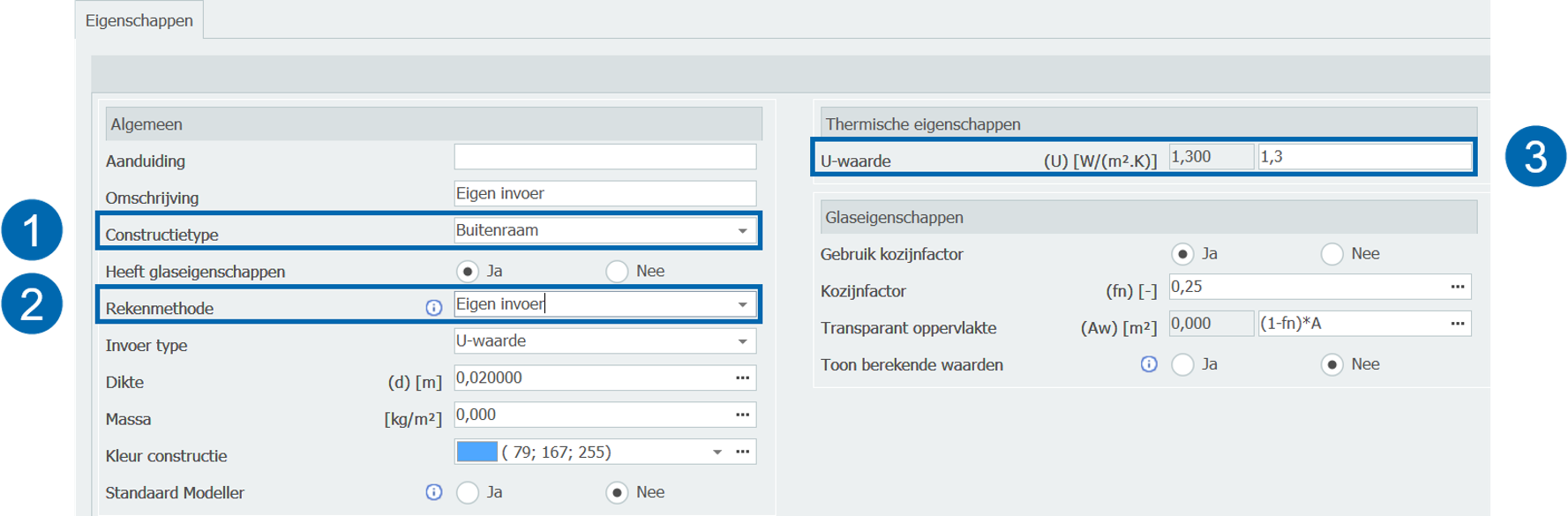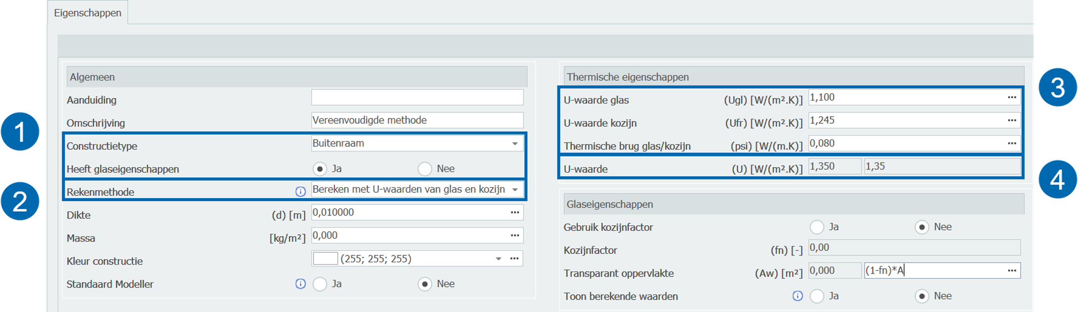 In de NTA 8800 zijn twee methodes beschreven waarmee de warmtedoorgangscoëfficiënt (Uw-waarde) van ramen en raamdeuren berekend kan worden, het is ook mogelijk een eigen Uw-waarde in te vullen: