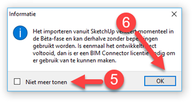 Een informatiescherm wordt nu zichtbaar. Kies hier voor "Niet meer tonen" (5) en klik vervolgens op "OK" (6)