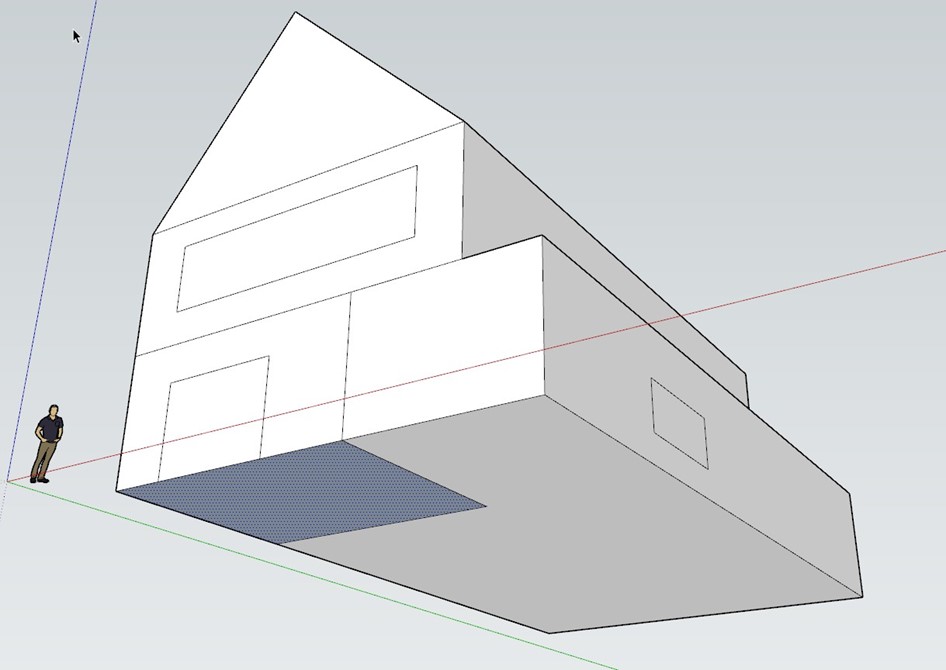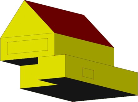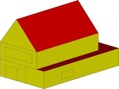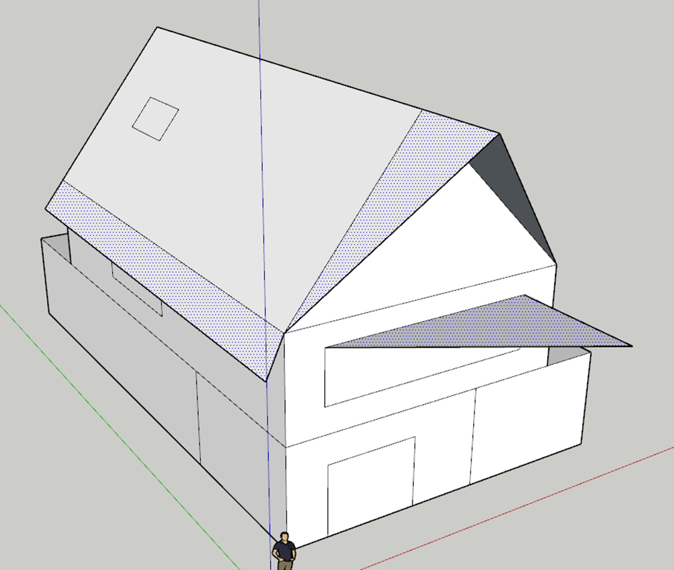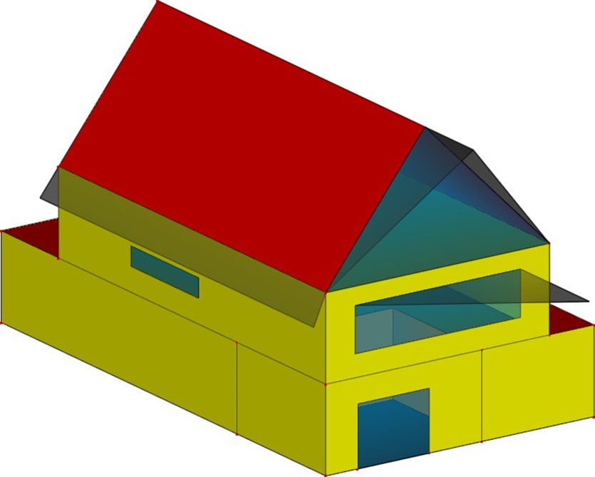 Het onderstaande model bevat vele dubbele lijnen voor constructies. Gebouwprestatie kan alleen ruimten importeren die zijn opgebouwd uit vlakken. Bijvoorbeeld: in deze situatie zullen de zonnepanelen geïmporteerd worden als ruimten.