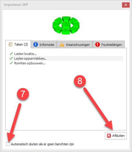 Het controlescherm geeft aan of de import is geslaagd. Kies voor "Automatisch sluiten als er geen berichten zijn" (7) en klik daarna op "Afsluiten" (8).