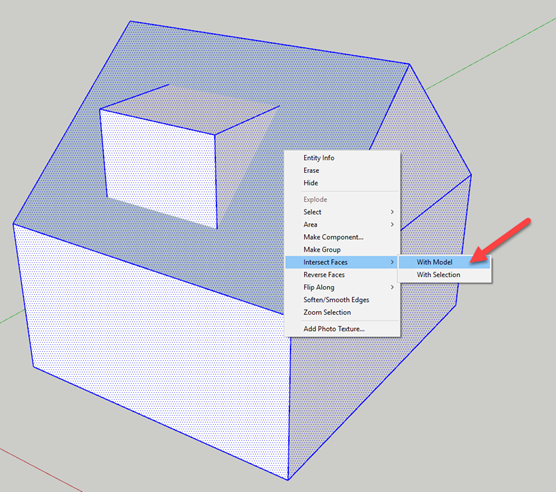 Selecteer het model met de rechter muisknop en kies vervolgens "Intersect Faces", kies voor de optie "With model".