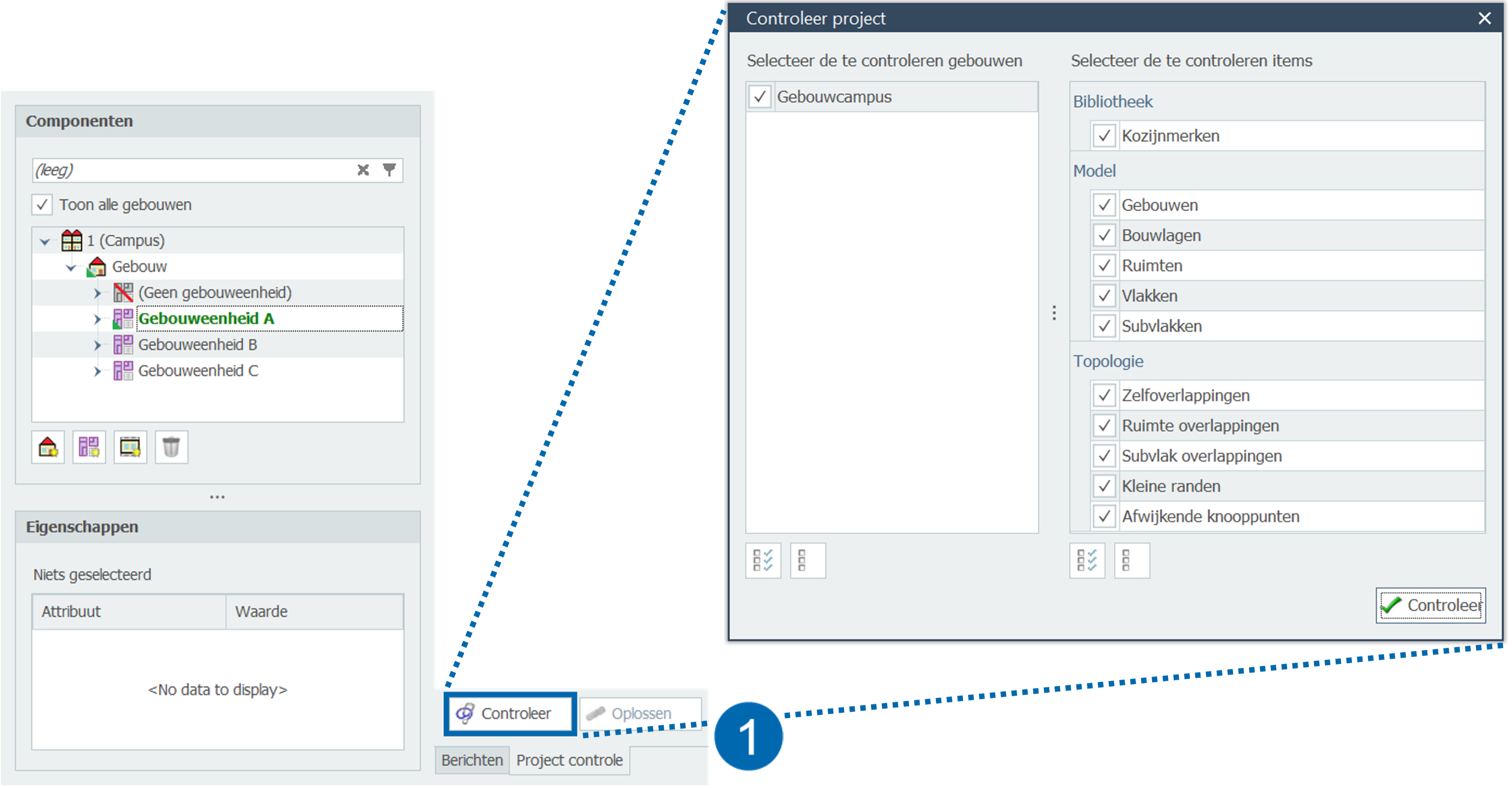 - Projectcontrole in de Modeller: hiermee worden fouten in het model gedetecteerd en (in veel situaties) mogelijke oplossingen aangeboden.