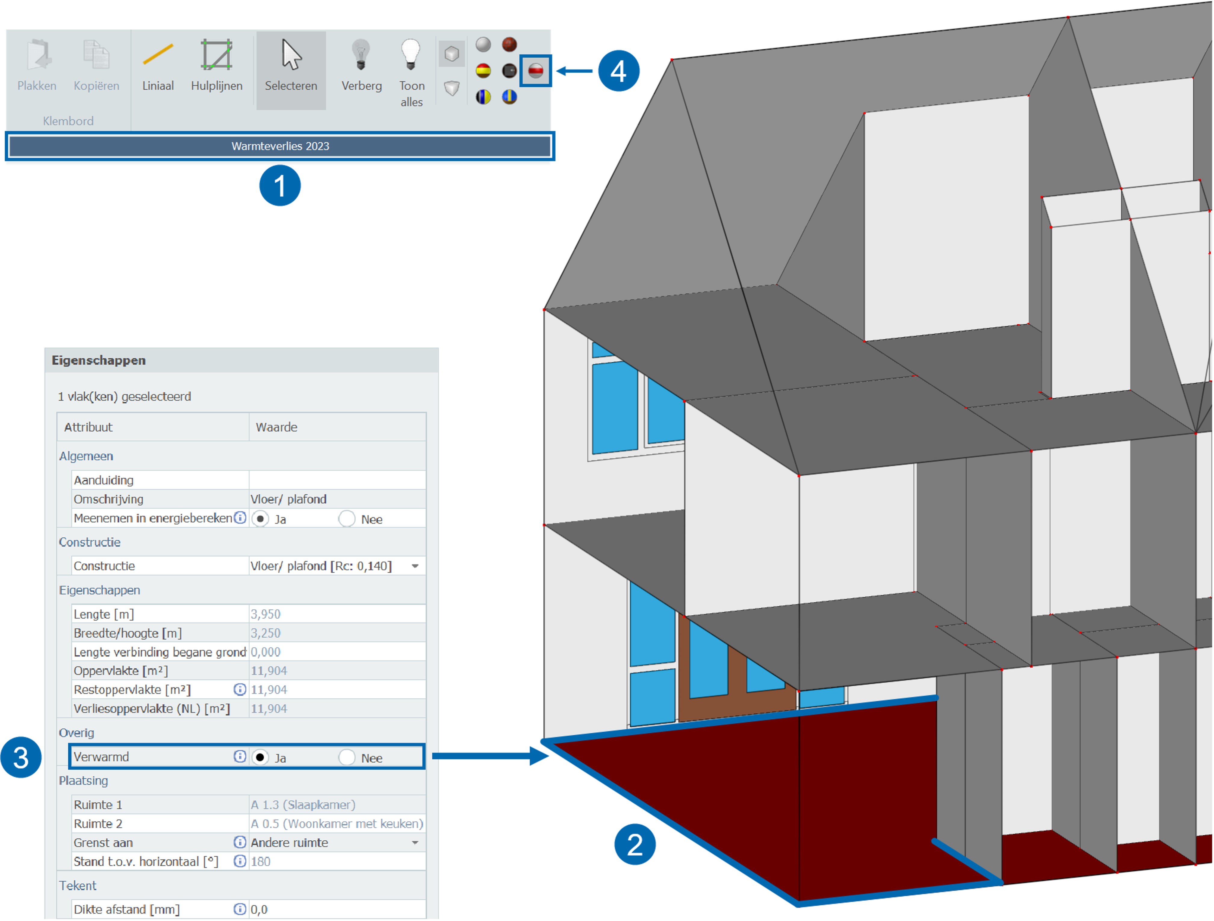 - Selecteer de "verwarmd-view" bovenin de ribbon. Hiermee worden verwarmde vlakken rood uitgelicht.