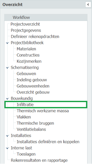 De bovenstaande tabel toont per ISSO- publicatie op hiërarchische wijze de noodzakelijke invoer voor de bepaling van de infiltratie (forfaitaire methode).