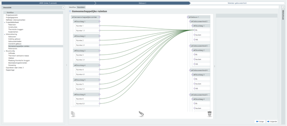 Alle gemeenschappelijke ruimten (links) in dit voorbeeld zijn gekoppeld aan de ruimte ‘Bk’ in Gebouw 1.