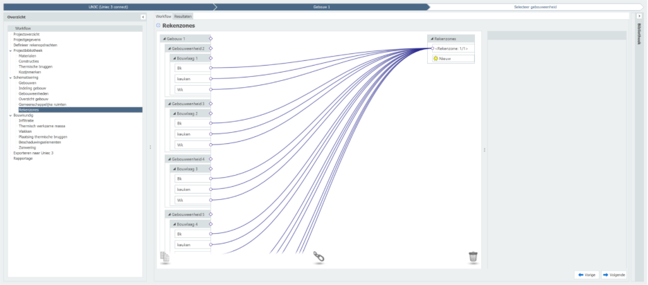 Dit project is als type project “Gebouw” geexporteerd naar Uniec 3, na het importeren van het bestand kan je de gemeenschappelijke ruimtes terugvinden en de gekoppelde rekenzone 1.