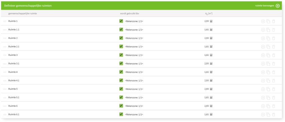 Het toekennen van gemeenschappelijke ruimten aan rekenzones is ook mogelijk voor project type utiliteitsgebouw. Het enige verschil is dat er bij utiliteit gekoppeld wordt aan gebruiksfunctie per rekenzone. In dat geval kunnen er meerdere koppelingen van ruimtes per rekenzone gemaakt moeten worden, om aan de juiste gebruiksfuncties te koppelen.