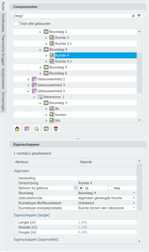 Bij de tab ‘Rekenzones’ in Gebouwprestatie zie je dat deze ruimte, samen met de andere ruimtes in dit model behoren tot rekenzone 1.
