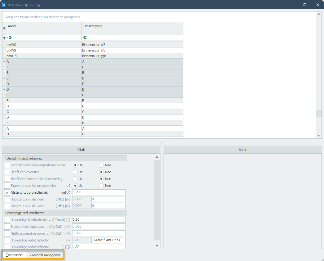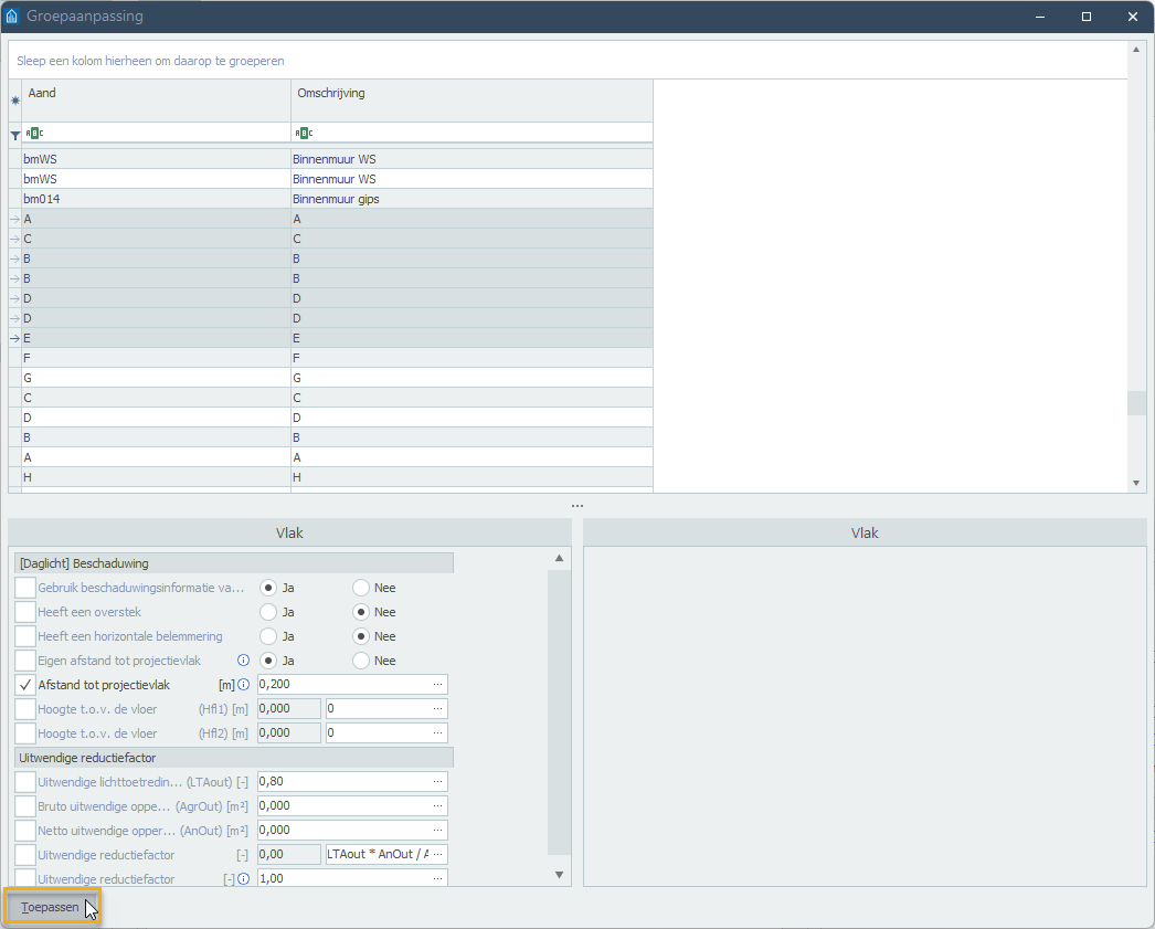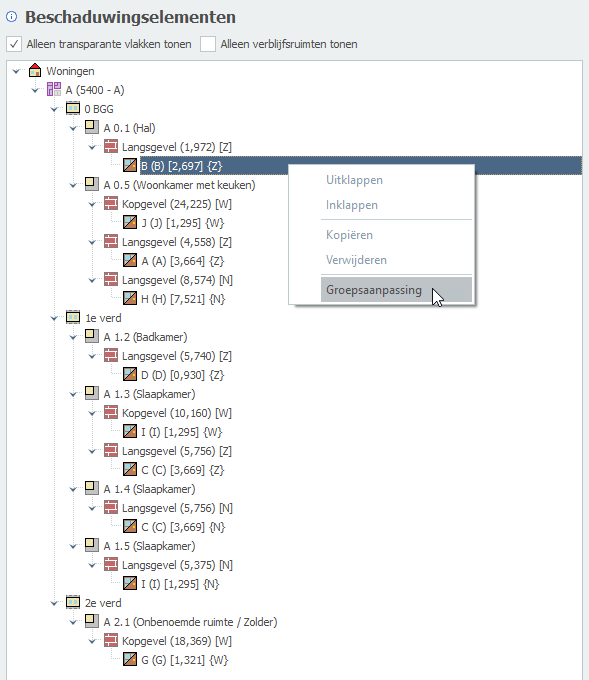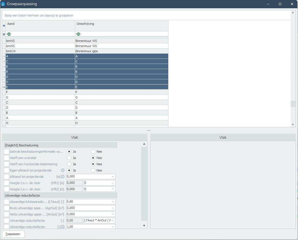 In Gebouwprestatie heb je de mogelijkheid om een groepsaanpassing uit te voeren. Groepsaanpassing kan worden gebruikt om een set aan gegevens in één keer voor bijvoorbeeld meerdere ruimtes/ramen etc. aan te passen.