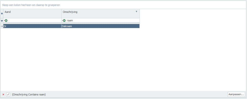 Het is ook mogelijk om te groeperen per kolom of te filteren door in de invoer kader te typen onder de kolom naam (zie afbeelding hieronder waar gefilterd is op Omschrijving en als waarde Raam.