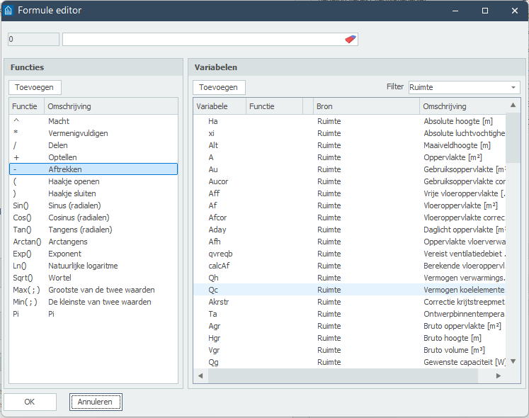 In de Formule editor zijn de mogelijke functies links weergegeven. Rechts staan de mogelijke variabelen en de beschrijving van de variabele. Om meer variabelen weer te geven kan je het Filter aanpassen rechts bovenin, in dit voorbeeld staat deze op Ruimte. Klik op [Toevoegen] om een geselecteerde functie of variabele toe te voegen aan het invoerveld. Zodra de formule gereed is klik op [Ok].