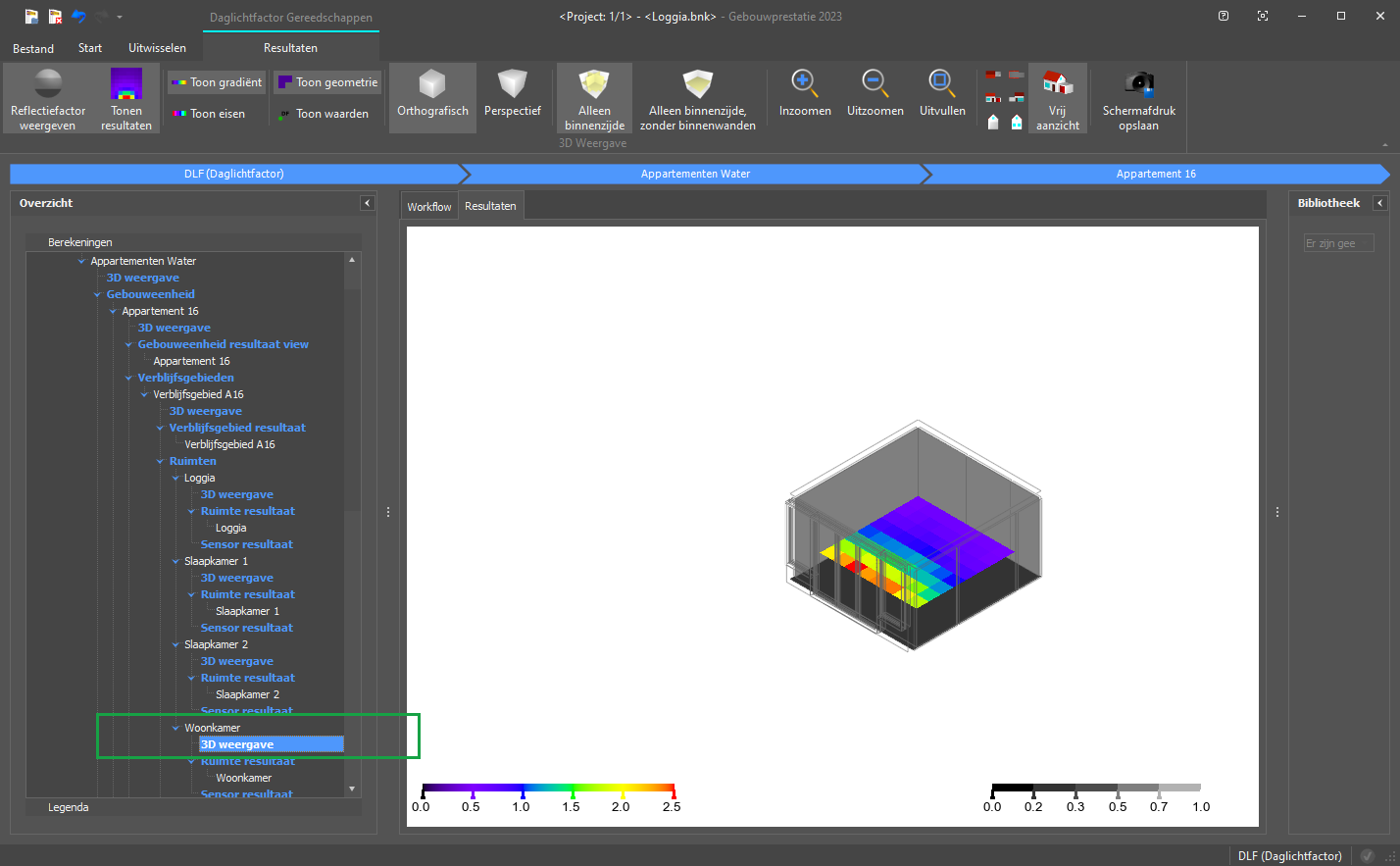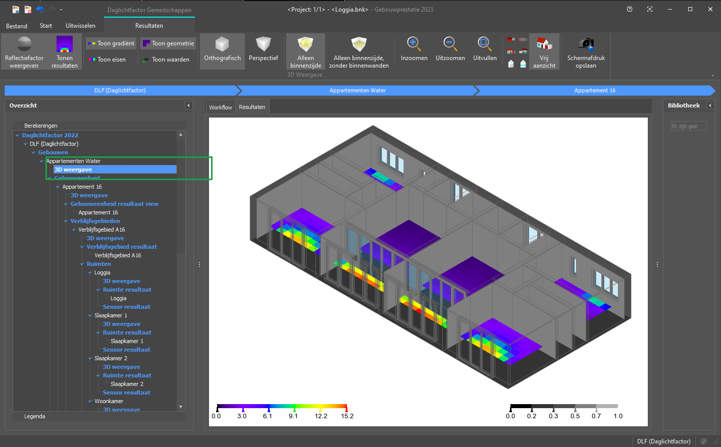 Het is ook mogelijk om de lichttoetreding van een loggia weer te geven. Als dit niet zichtbaar is , dan voldoet mogelijk de Hoogte-eis niet. Ga hiervoor naar de Modeller en pas de Hoogte-eis voor de ruimte aan.