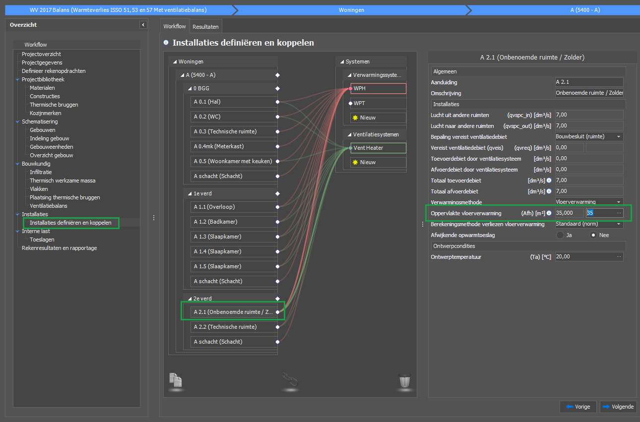 - In het detailvenster aan de rechterkant is het mogelijk om de Oppervlakte vloerverwarming aan te geven.
