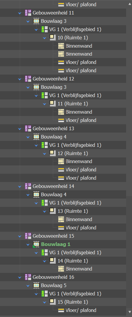 ‘Uitklappen van Boom’ met alle gefilterde elementen. Selecteer ‘Gebouw’ en druk op * op je numerieke toetsenbord. Alle gefilterde onderdelen worden nu zichtbaar.