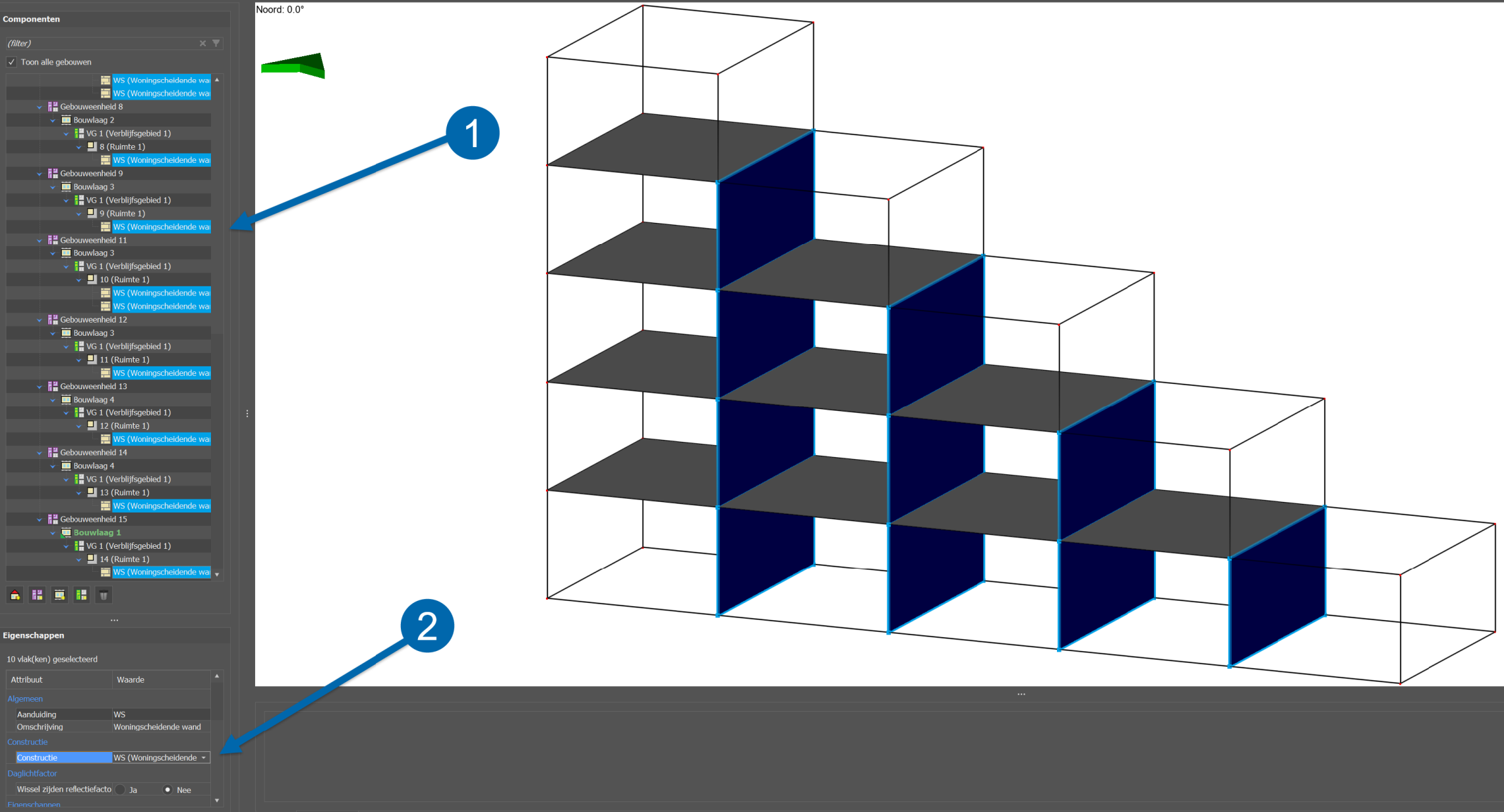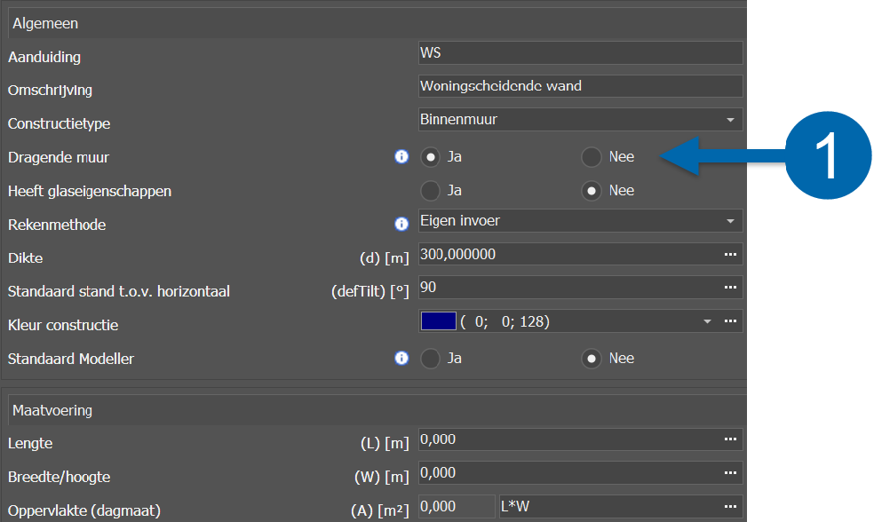 Vergeet niet voor een woningscheidende wand de eigenschap mee te geven dat het een ‘Dragende muur’ is (1).