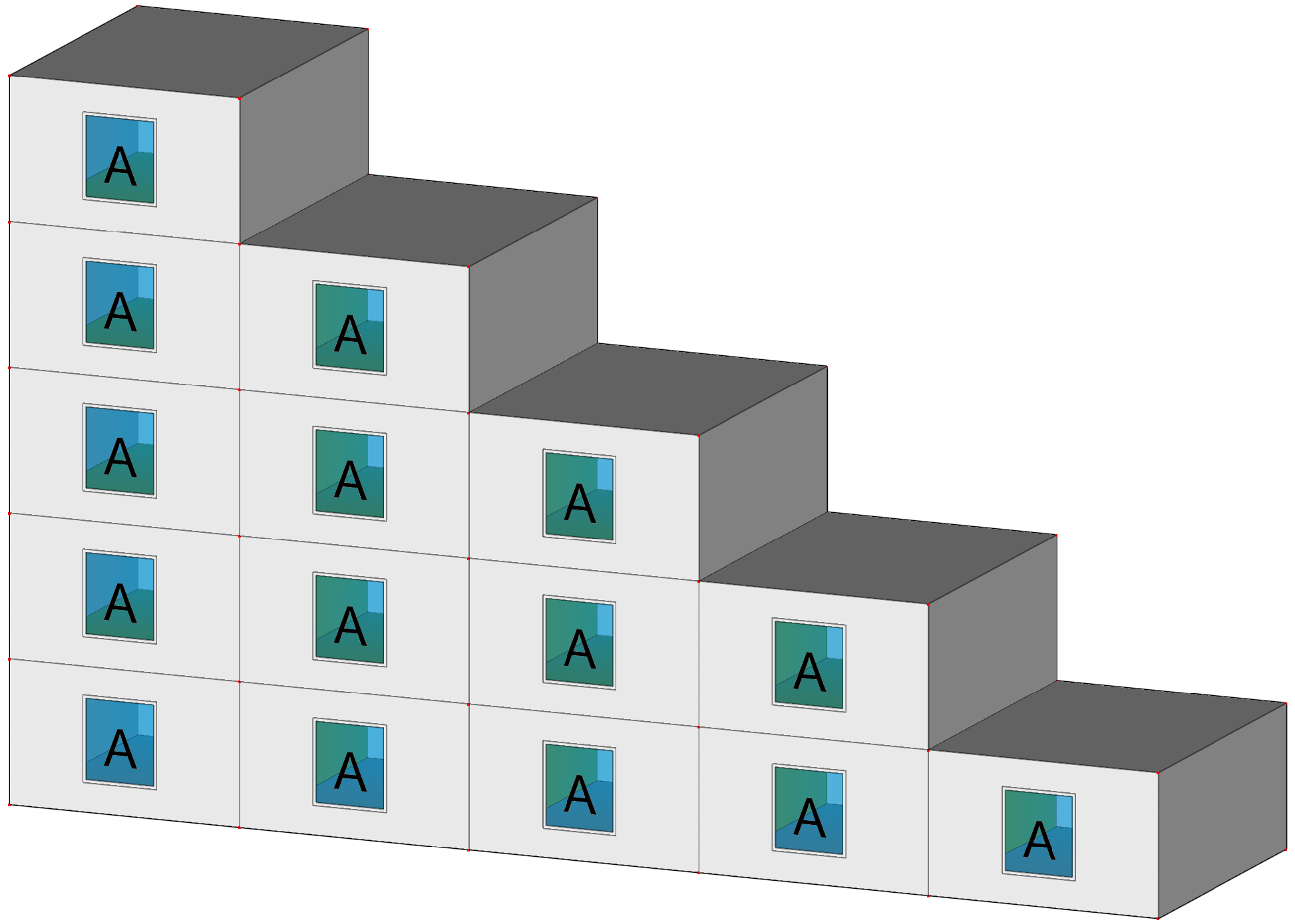 Voor het in de figuur weergegeven gebouw gaan we eigenschappen toekennen aan de wanden die de begrenzing vormen tussen de gebouweenheden.
